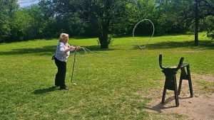 While strolling through the museum, Jackie tried her hand at lassoing a Texas longhorn calf. As you can see from the photo, the calf did not escape, which means she has hidden cowboy skills.