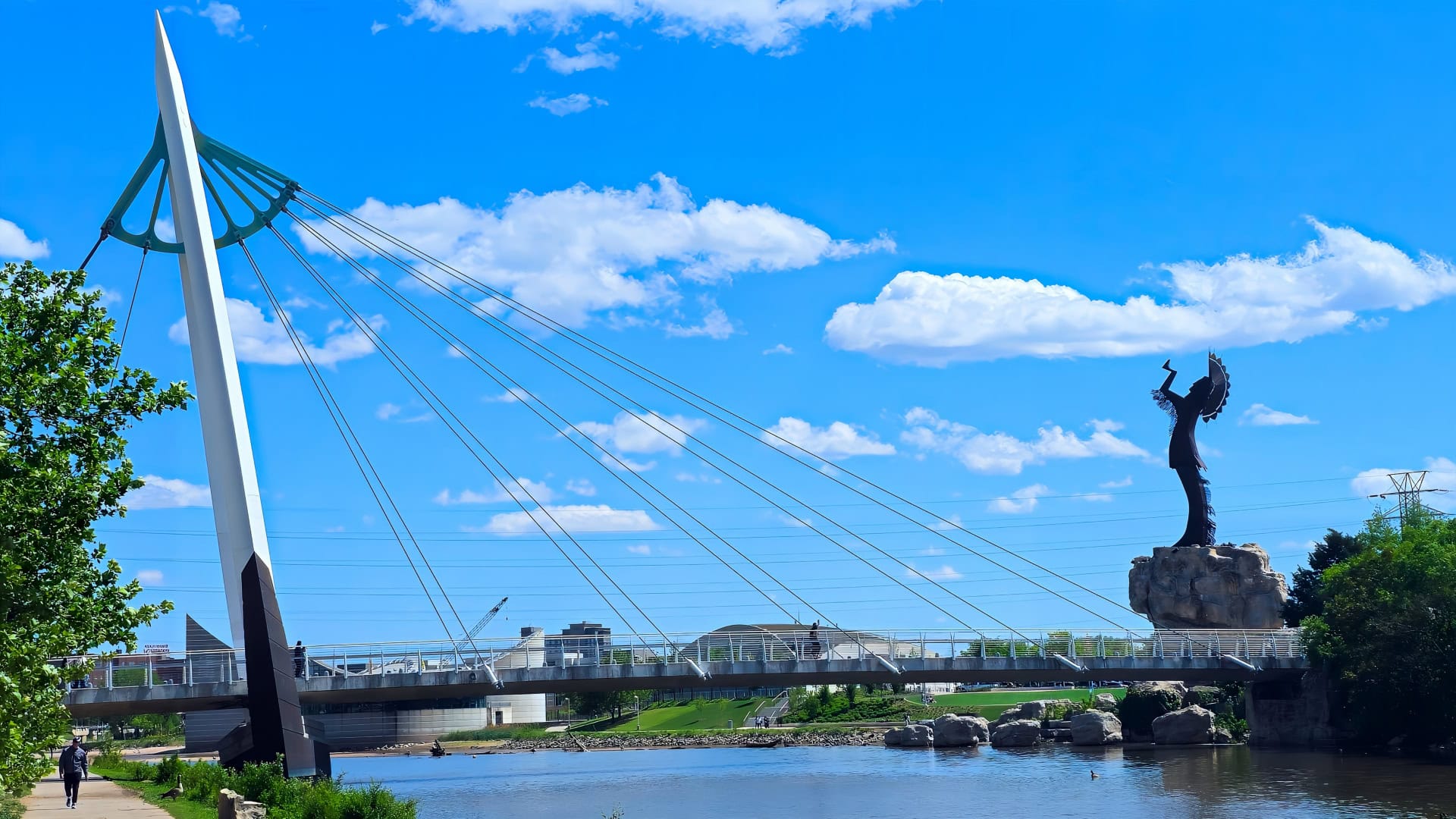 We did manage to get our e-bikes out a few times while in Wichita, including one especially nice ride along the Arkansas River. At the point where the Little Arkansas River meets the Arkansas River stands the Keeper of the Plains, a monument honoring the Indigenous heritage of the area. As you can see from the photo below, the statue sits on a rock promontory and is quite impressive. You can walk, or in our case, ride your bike, right up to the base via pedestrian bridges.